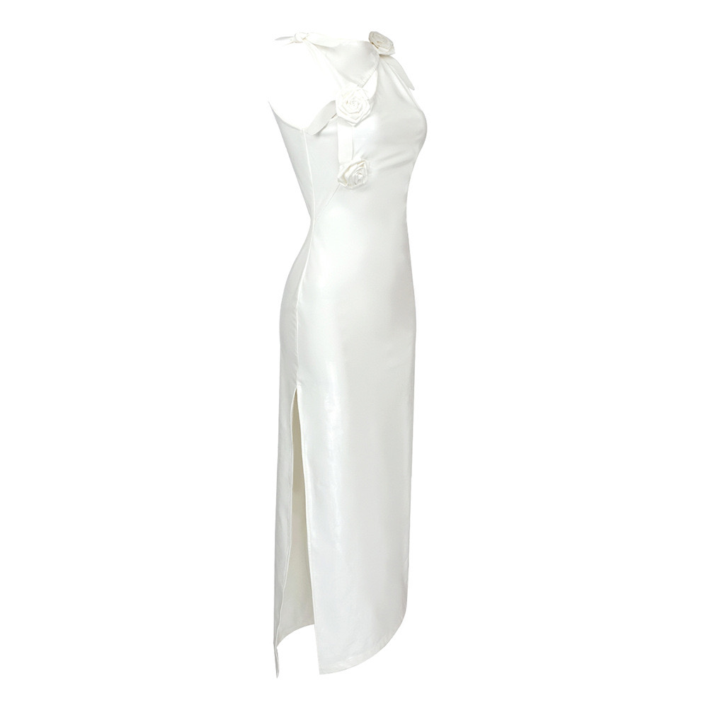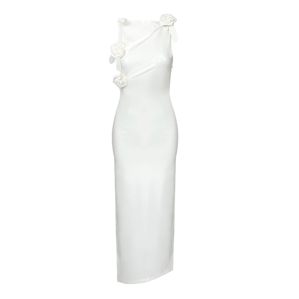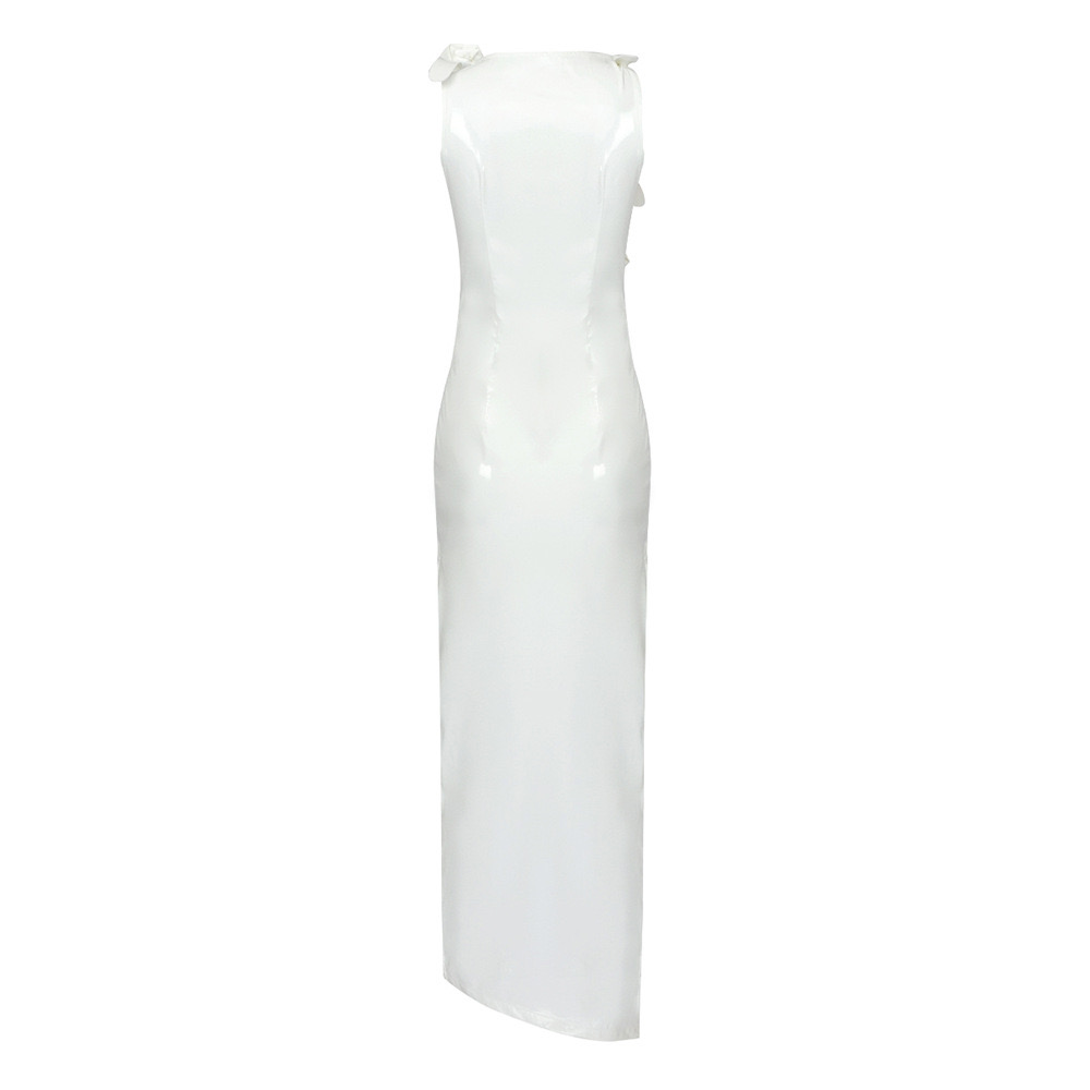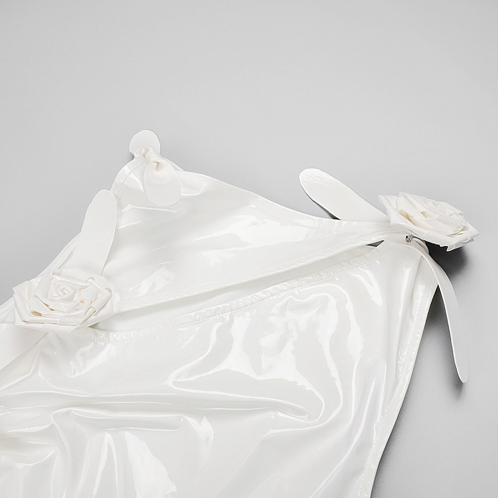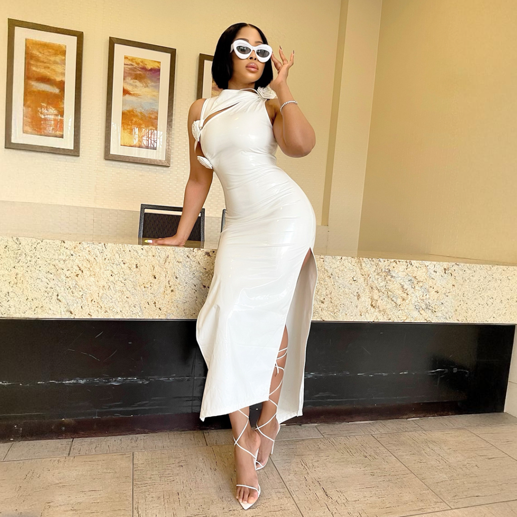Get glam in our Madi latex dress! with a featured cutout in the chest with a rose detail design. Styled with some strapppy heels and a mini bag for glam look.- Fabric: 50% Polyurethane 47% Polyester 3% spandex