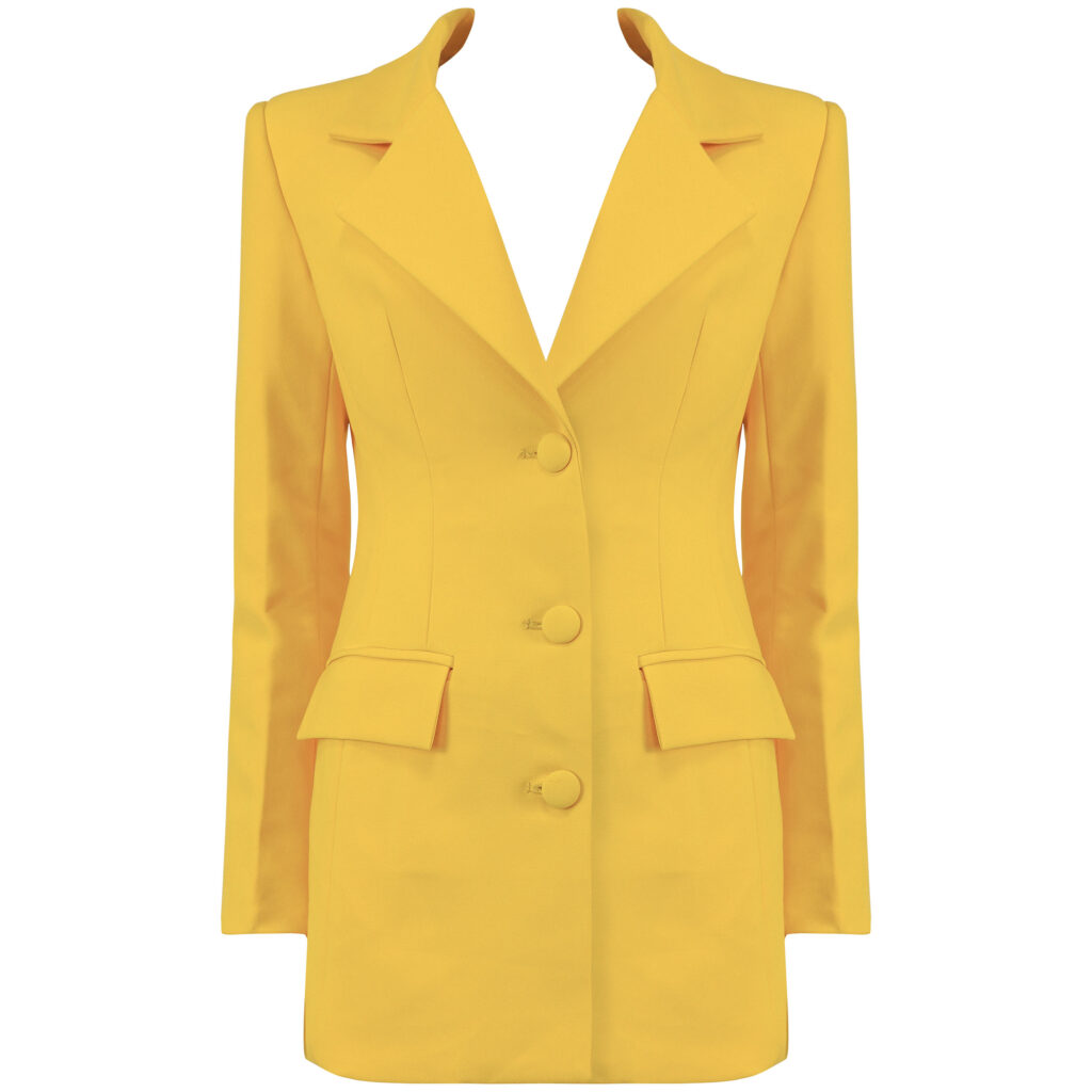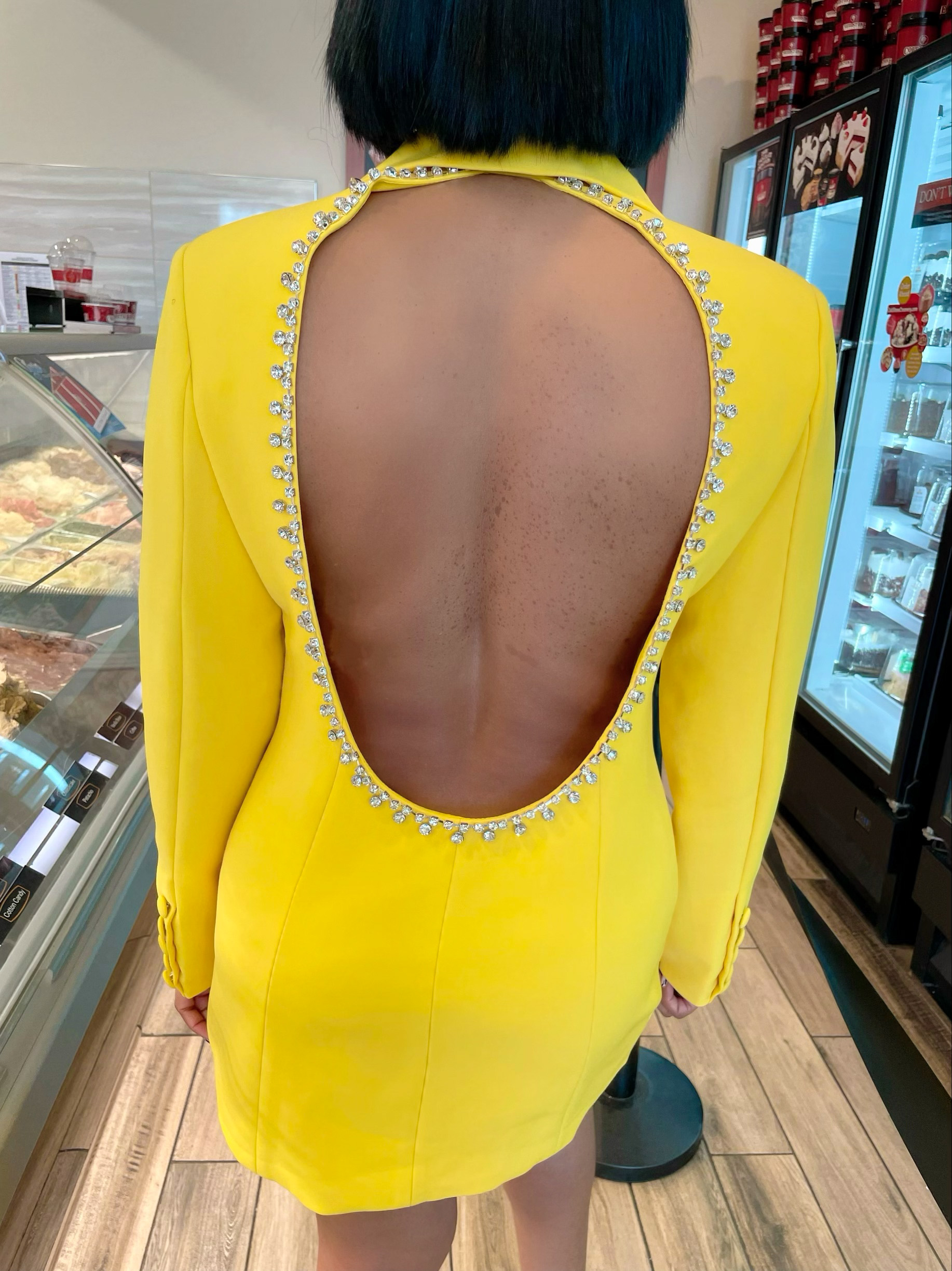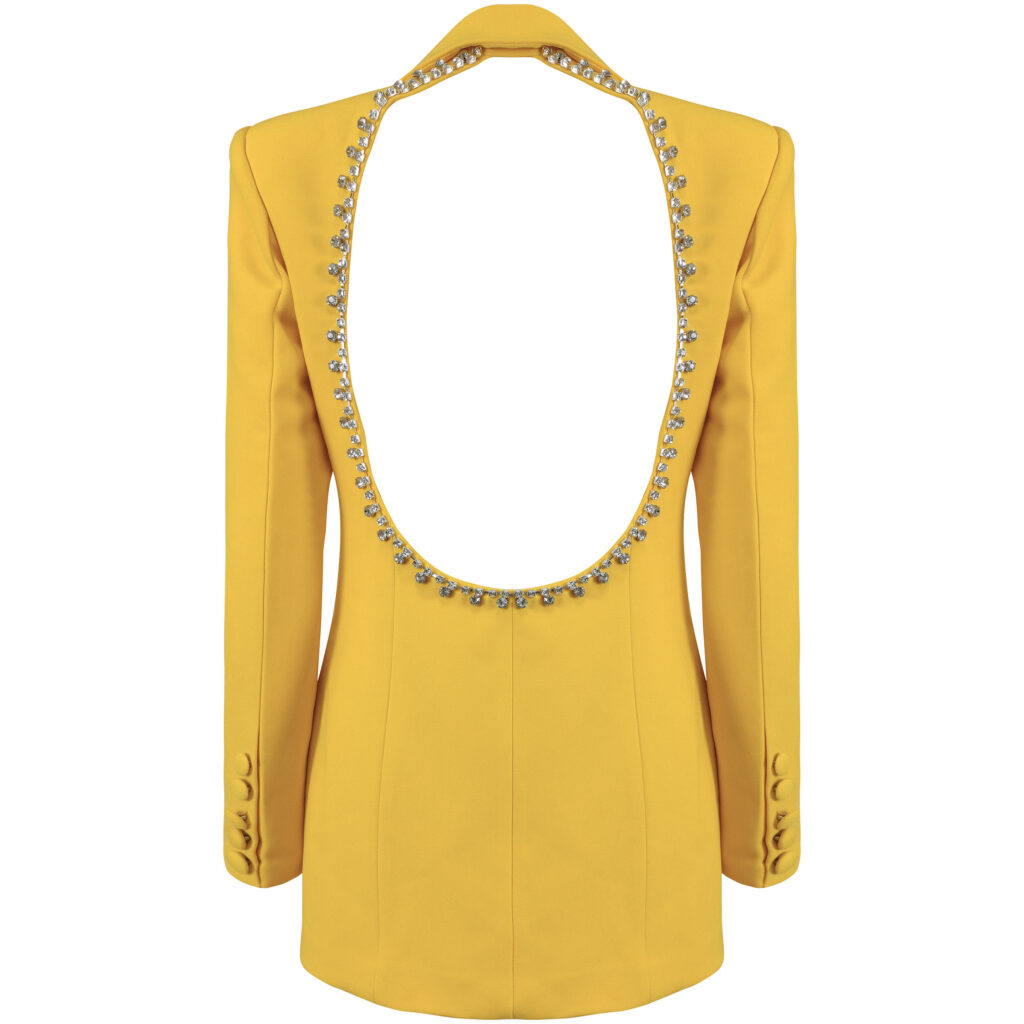 This is not your regular Blazer Dress! With a cutout back detail lined with crystal, there’s no way this unique piece should not be in your wardrobe. This item can also be worn as a blazer with shorts or pants. “Runs small” EXCEPTIONAL QUALITY!- Color: Yellow