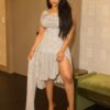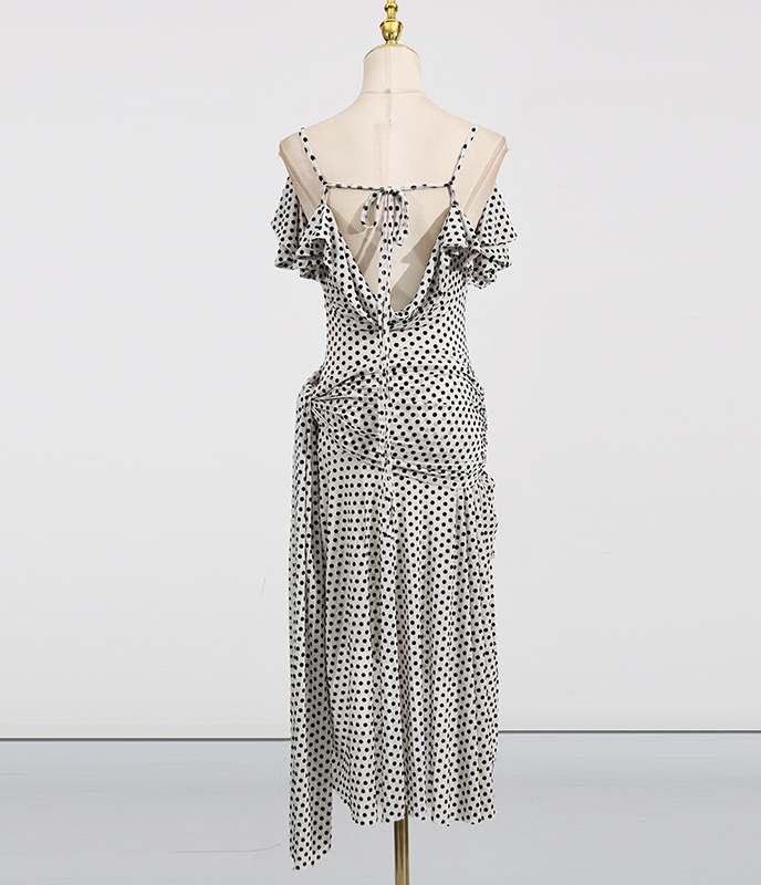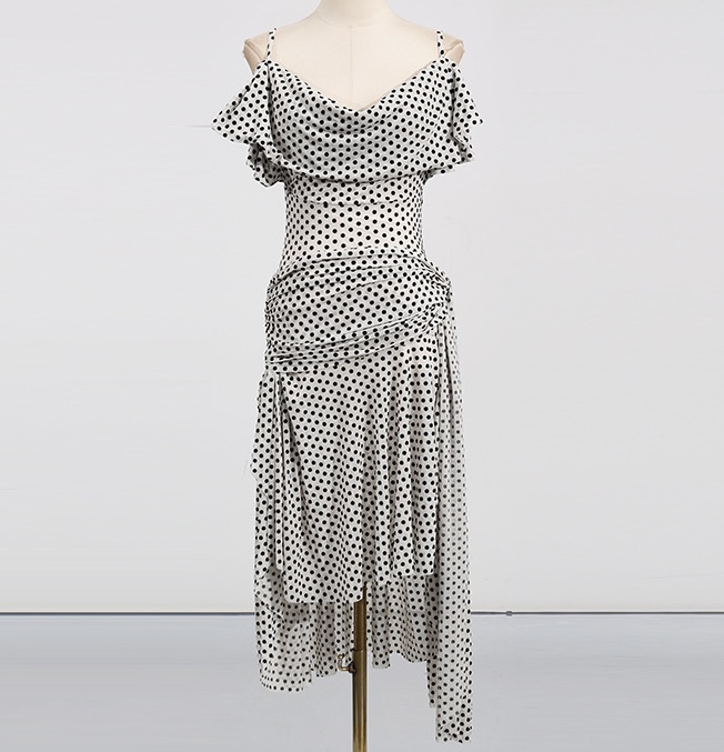 This super glam Polka Dot dress is made from a stretchy sheer fabric. with draped front and back design.